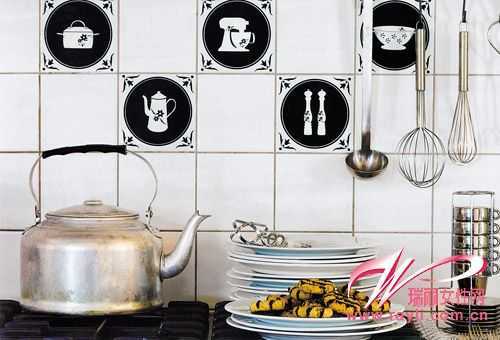 用装饰有餐具的瓷砖装饰厨房墙面,再合适不过了,让这些绘制了餐具的瓷砖错落点缀于白色瓷砖之间,丰富了墙面。
