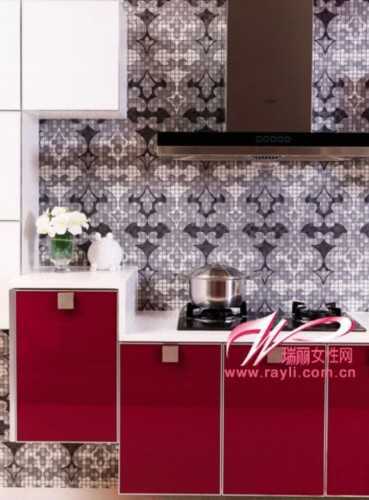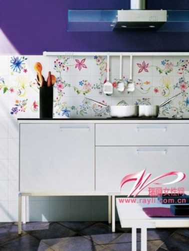 手绘瓷砖墙面营造厨房温馨情调 单纯的白色与紫色搭配略微硬朗,为了突出温馨的感觉,在白色与紫色过渡的地方规则地拼贴上手绘花草图案瓷砖,上面鲜艳的花朵和妩媚的枝蔓让硬朗的感觉一扫而光,在现代感的橱柜映衬下,一个对比强烈但不失温馨的厨房呈现在眼前。