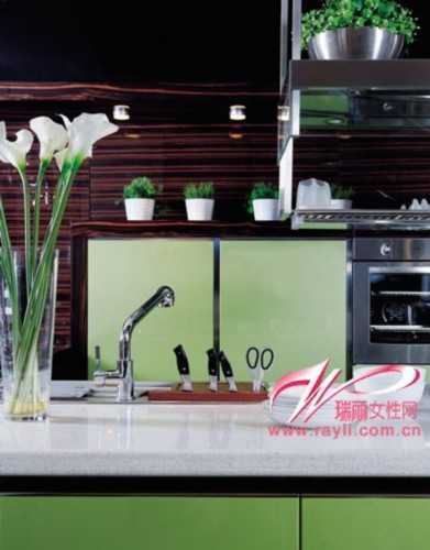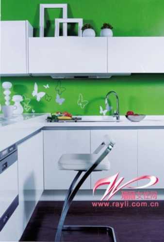 零星涂鸦厨房墙 零星涂鸦,绿色墙面分外出彩白色的烤漆橱柜不仅色调纯净,而且质感十分突出。在绿色防水涂料营造的背景墙下,这种纯净的感觉越发强烈。绿色与白色的对比非常和谐,让人有亲近自然的舒适感。在背景墙上零星地点缀白色或灰色的涂鸦,翩翩起舞的蝴蝶仿佛活灵活现地浮现在眼前,为厨房增色不少。