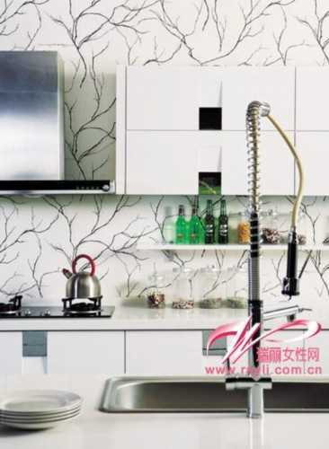 厨房墙枝丫图案 枝丫图案强调墙面与橱柜的过渡,大面积的白色橱柜未免有些单调,好在灶具和水槽上有金属色和黑色的点缀,才不至于视线一片惨白。为了烘托白色的纯净感,同时不破坏现有搭配的和谐,墙面选择了带有黑色枝丫图案的白地壁纸进行过渡,它有效协调了大面积白色与点缀色的关系,让橱柜这一主体得以更好展现。