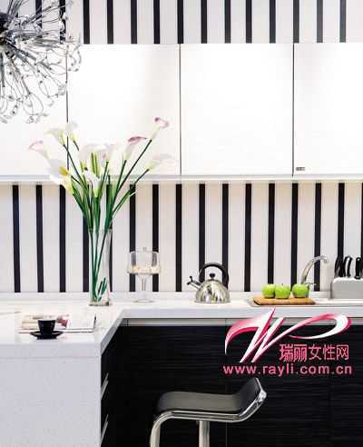 条纹壁纸扩大厨房空间纵深感 条纹壁纸扩大空间纵深感,白色烤漆材质与木纹贴面材质的深浅搭配,让橱柜展现出变化的层次感。但深色调的木纹贴面让人容易将视线集中在下半部分,为了给上部空间营造一些亮点,用黑白相间的条纹壁纸铺贴墙面,竖向的条纹有拉伸空间纵深感的作用,不仅成功营造了视觉亮点,也有效延展了视觉空间。