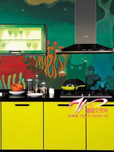 用色彩涂鸦打造诙谐厨房背景墙 黄绿色的柜体十分抢眼,搭配上同色系玻璃柜门,跳跃的感觉更加强烈。但对于追求个性的年轻人来说,单色调还不够满意。所以在墙面大胆尝试了色彩涂鸦。夸张的图案与柜体的色调相得益彰。对很多人来说这种强烈的色彩对比不敢接受,但对于崇尚个性的人却不失为一个好选择。