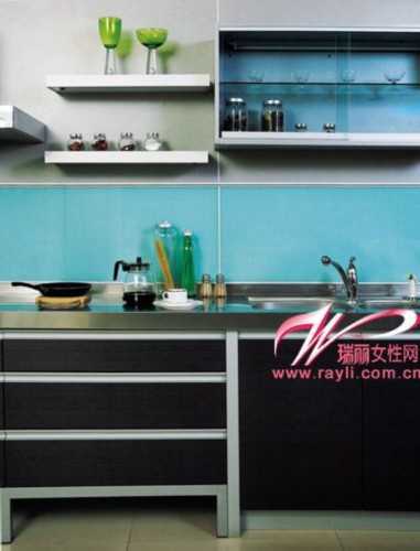 小面积应用玻璃提升厨房轻灵感 如果觉得大面积使用玻璃存在安全隐患,不妨尝试一下这种小面积搭配玻璃的组合方式。拉丝背板搭配淡蓝色的玻璃,让玻璃一跃成为视线的焦点,拉丝背板也同时呼应了橱柜的整体色调,这两种材质的和谐过渡有助于突出厨房的主题。