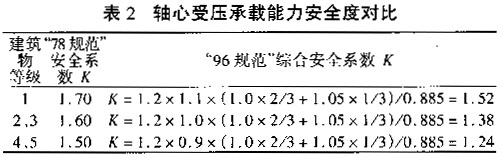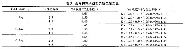 4.2 受弯构件承载能力安全度对比 以矩形截面为例,在不计受压钢筋情况下: “78规范”表达式:KM≤RWbx1(h0-x1/2) “96规范”表达式:1.2×γ0M(1.05×1/3+1.0×2/3)≤ fcbx 2(h0-x2/2) 根据力的平衡条件,有RWbx1 =f cbx 2, x 2=1.42x1,则 “96规范”表达式改写为:1.22γ0M≤f cbx 2(h0-0.71x 1) 由此可以看出,受弯构件的安全度不仅与截面尺寸及混凝土强度有关,而且还与混凝土受压区高度有关。综合考虑上述因素后,矩形截面受弯构件承载能力安全度对比(表3)。