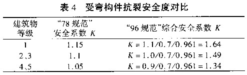 4.3 受弯构件抗裂安全度对比 根据南水北调中线总干渠的设计运用原则和DL5077—1997的规定,渡槽的设计水压力与永久荷载组合为长期组合,长期组合系数ρ取1.0。于是有下述受弯构件抗裂验算表达式。 “78规范”表达式:KfM≤γRfW0 “96规范”表达式:γ0M≤0.7γf tk W0 按上述表达式,长期荷载组合效应下的钢筋混凝土受弯构件抗裂安全度对比(表4)。