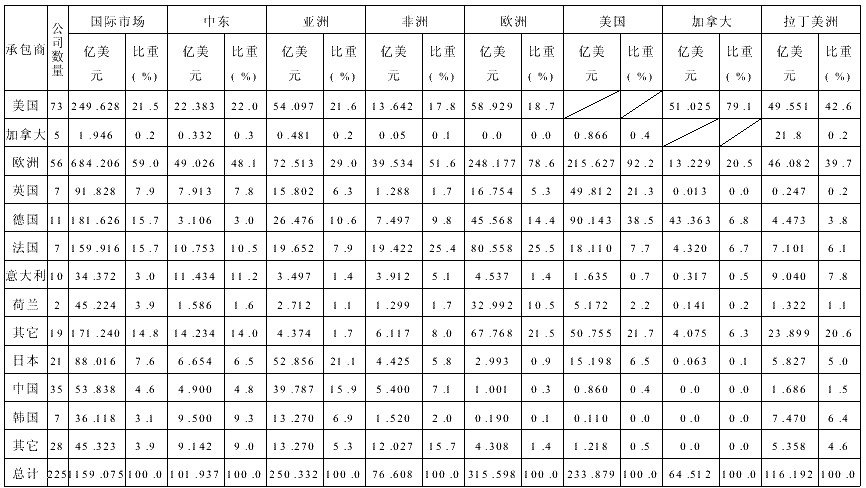 表3 2000年全球225家最大承包公司营业额的市场分布 单位:亿美元 管理特点以日本为例:大成、清水、鹿岛、竹中工务店、大林组、熊谷组是六大承包商,这些公司,一般不拥有自己的施工队伍,而是充当总承包商的角色。经营特点是:①智力密集型的人才组织结构;②较强的科研设计和开发能力;③将企业国际化做为发展战略目标;④重视技术创新和员工的素质培养。其管理优势是:①灵活合理的组织机构,精干高效的管理班子;②重视发挥作业所所长在项目管理中的核心作用;③细致的专业分包和严格的合同管理;④以质量、安全为重点的全过程监督控制。