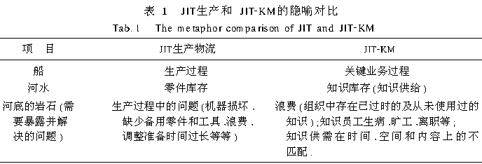 在知识管理研究的基本框架中,应包括“5W1H”要素,即知识管理研究的主体(Who)、客体或称对象(What)、时间(When)、地点(Where)、原因(Why),以及实务(How)。时间是知识管理研究中的一个重要要素。这是因为知识本身具有一定的时效性(know when),只有在特定时间下的特定主体与客体、特定地点所构成的特定环境下才能够体现出知识的价值。相应地,知识管理也具有时效性。 正是知识管理的时效性,就必须考虑知识管理的准时性问题。Keesd Huy研究并提出了准时知识管理的概念[1]:准时知识管理(JustInTimeKnowledgeManagement,简称为JIT KM)是将物流概念中的准时制理念融入到知识管理领域,以实现知识供给与知识需求之间匹配过程的最优。美国生产力和质量中心(APQC)在研究知识管理时也强调了知识管理的准时性问题。他们认为,知识管理应该是组织一种有意识采取的战略,它能够保证在最需要的时间将最需要的知识传送给最需要的人[2].准时知识管理的研究对于组织进行有效的知识共享、知识传递等知识管理活动具有重要意义。 1、准时知识管理的目标、理念与准时知识管理模型分析 1.1 准时知识管理的目标和理念 准时知识管理应该实现的目标包括[1]:①发现由于知识需求和知识供给之间的不匹配造成的知识缺口并及时地吻合缺口,解决知识供需间不匹配问题;②把市场开发转化为组织中的知识库;③组织有能力将专家们安排到最适合的岗位中;④组织能够预期新的技术开发;⑤降低成本,提高企业竞争优势。 JIT的理念最早广泛运用于物流管理,融入到知识管理中,就形成准时知识管理的理念。 1)以人为本的理念。JIT理论认为企业最宝贵的财富不是机器、厂房,也不是产品,而是人。人是企业发展的智慧之源,只有每个人都充分发挥其积极性和创造才能,企业才能创造并获得最大利润,才能保持竞争优势和可持续发展。为此,企业在为提高员工素质而进行培训、制定激励员工工作积极性与主动性的有效薪酬制度、授权等方面应该投入大量精力。准时知识管理也强调“以人为本”,但它具有更深一层的意义。由于人是知识最重要的载体和创造者(特别是对于能够形成企业核心竞争力的隐性类知识),知识离开人的创造性,知识的生产与创新也就无从谈起,知识管理也就失去其意义。因此,JIT KM中的“以人为本”强调充分重视知识员工的自身特点与工作特点,构建灵活的薪酬体系,采取“柔性”的人力资源管理策略和科学有效的激励机制。 2)降低知识库存,暴露问题,消除浪费的理念。在JIT生产中经常会用到一个隐喻来说明这一理念:行驶在河中的船代表生产过程,为了实现顺利的生产过程(船在河中顺利航行),不出现问题(不会撞到河底的岩石),传统的方法是增加产品库存(提高水位),其结果导致管理水平降低、生产成本增加。而在JIT中,要强制性地暴露问题,就要将库存不断降低(追求零库存),以降低成本。在准时知识管理中也应体现这一理念。尽管一定的知识库存对于知识活动是必要的,但是,可以通过知识库存的降低来消除那些已经过时的、无用的冗余知识库存(包括过多的知识工人和冗余知识),这些冗余知识库存极大地增加了知识生产、知识传递、知识利用、知识保护等知识活动的成本,造成了很大浪费,也严重隐瞒了企业知识管理过程中存在的问题。所以,准时知识管理不追求知识库存水平的一味增加,即知识存量的无限增大,而是追求知识产品生产过程中,能够有效实现知识供给和知识需求准时匹配的最精简的知识库存。可以将传统意义上的JIT生产物流和JIT KM的隐喻进行对比,如表1所示。