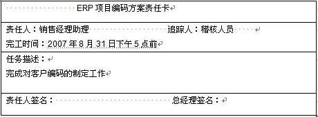 如此,设计后,哪些重点,要先完成哪些任务,一目了然,无论是CIO,还是具体的执行者,可以按照此有序的进行攻关,就能有效的保证任务在规定的时间内完成,不让次要的任务过多的占据宝贵的项目时间。落实责任人与时间,计划得以执行的保障 任务分解分析后,还不行,还要落实责任人,确定具体的完工时间,任务才有可能按照CIO预先设计的时间内完成。 在项目执行时,笔者比较喜欢用责任卡制度,来管理项目组成员。 在责任卡上,要标明以下内容。 1、任务负责人:企业中,人人各负其责,人人都有专长,CIO不可能取代其他专业人才的地位,去帮他们决定一些内容。如CIO不可能代替物管人员去决定物料的分类,代替销售人员去决定客户的分类,这些任务CIO要分配给专业人士,并指定具体的负责人。 2、追踪人:在分配任务时,要指定一个追踪者,以时时跟踪任务的进度。 3、任务名称。 4、完工时间:要明确定义完工的时间,最好以天为单位,而不要以周或者月为单位,有必要时,还可以细化到小时。 5、审核员:在此处,最好能签上一把手的名字,给相关人员一种压力。 6、责任人签名:让责任人签上自己的大名,以加深印象,增强责任。
