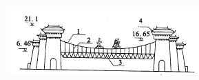 太旧高速公路武宿收费站,路面宽度80m,设有十一个车道,该收费站两侧为钢筋混凝土塔楼,总高度21.4m,中部为预应力悬索网架顶棚,悬索网架总跨度61.4m,网架高度0.8m,网架顶标高6.46m,主悬索顶标高16.65m,主悬索两侧通过冷铸锚具锚固在塔楼上,网架通过27道人字形吊杆索与主悬索连接,同时网架两端采用橡胶支座与塔楼连接,塔楼、预应力悬索网架巧妙组合,造型别致新颖,简捷轻巧,古典优雅,见图1。