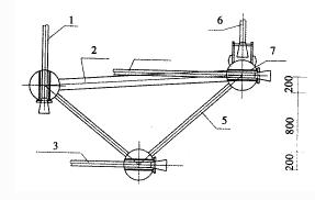 图1 预应力悬索网架示意 1-主悬索;2-吊杆索;3-网架;4-塔楼 1 筒体塔楼施工 两侧矩形塔楼采用钢筋混凝土筒体结构,其平面尺寸至下而上逐步收缩,塔身墙体倾角为82°,这一特点决定了墙体模板倾角定位是施工的关键技术,必须严格控制,我们采用了内定位、外校正的控制方案,即在塔体内搭设满堂脚手架作为轴线定位、模板体系支撑和施工操作用架三重作用,脚手架严格计算设计,塔楼中线逐层引上,再向四边分线确定墙体内模位置,从而使塔楼墙体层层定位准确,并在场内宽阔地带支设经纬仪校正墙体四角位置,做到准确无误,为网架及预应力悬索的就位提供了准确性。 2 网架制作安装 2.1 网架安装 网架平面尺寸为64.8m×6.0~10.44m,刚度很小,若整体吊装易变形,若现场制作工期长,架子用量大,堵塞交通且影响路面施工,为此我们采用分节制作,高空拼接安装的方法,即将整个网架分成五节,于场外制作,搭支撑架吊装就位后,再组装焊接、焊接采用单面焊接,双面成型,确保焊接强度与杆件等强,这样既保证质量,缩短了工期,节约了架子,又留下通道满足了路面施工。 2.2 网架与吊杆索、水平拉索的连接 网架与吊杆索、水平拉索之间通过索穿空心球连接,空心球端加承压板。为了解决水平拉索与网架上下弦杆交叉打架的问题,把固定水平索的上弦球节点比网架上弦杆平面提高200mm,下弦球节点比网架下弦杆平面降低200mm,如图2所示。