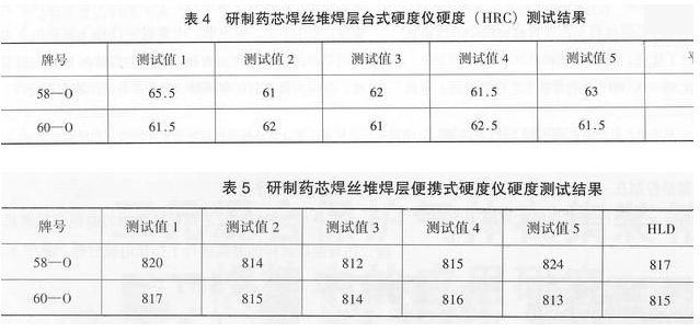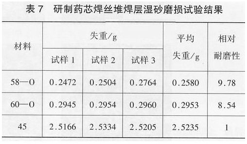 试验表明,在较低应力状态下,研制药芯焊丝堆焊层具有相当强的耐磨粒磨性能,高达45淬火钢的8~10倍,试验结果如表7所示。