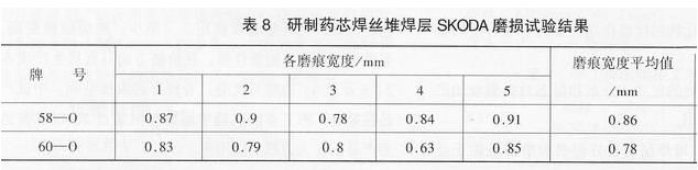 (2)SKODA磨损试验SKODA磨损试验技术参数:试验载荷15kg;转速600r/min;转数3000.研制药芯焊丝堆焊层的耐磨性是通过将在显微镜下测得标准硬质合金轮在试样表面进行定点滚动摩擦产生的磨痕宽度换算成磨损体积来衡量的。 试验表明,在较高应力状态下,研制药芯焊丝堆焊层同样表现出良好的耐磨粒磨损性能,试验结果见表8。