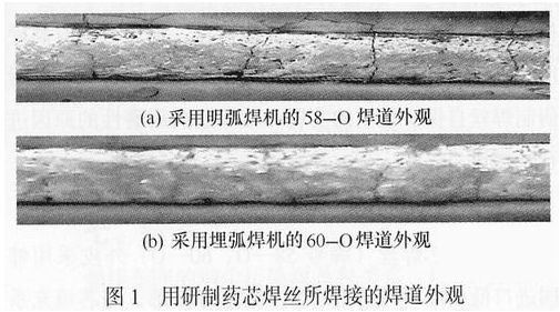 药芯焊丝58-O,60-O的焊接工艺性能优良:电弧燃烧稳定,焊道成形好,飞溅少,气孔很少,堆焊层致密无缩松,表面有少量渣点,不予清理不影响连续多层焊接,烟尘不大,噪声低。电弧稳定性和飞溅程度方面同类产品相比有突出表现。表层主要缺陷为横向微裂纹,是应力释放的正常现象,为大多数硬面堆焊所允许。 同一种自保护药芯焊丝在相同的焊接规范下由于采用的焊接设备不同,使得焊接工艺性能差异很大。58-O适合采用ZD7-1000型逆变直流明弧自动焊机焊接;60-O适合采用MZ-1000型埋弧自动焊机不加焊剂焊接,其焊道外观如图1所示。