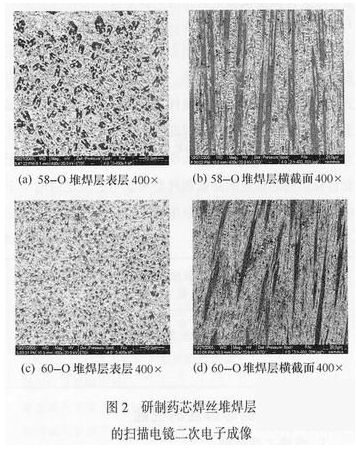 3.堆焊层金相组织 采用Quanta200型扫描电子显微镜对研制药芯焊丝堆焊层表面和横截面金相组织进行了分析,照片如图2所示。