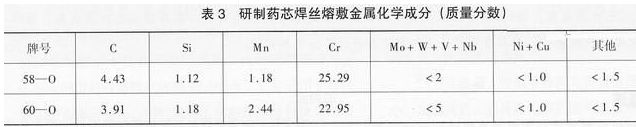 含有熔敷金属化学成分的CO2气体保护焊丝 2.熔敷金属化学成分 参照GB984制作堆焊试样,经900~1000℃、保温40~60min、炉冷的软化处理后钻取粉末进行化学滴定和红外吸收分析,测得的研制药芯焊丝熔敷金属化学成分见表3。