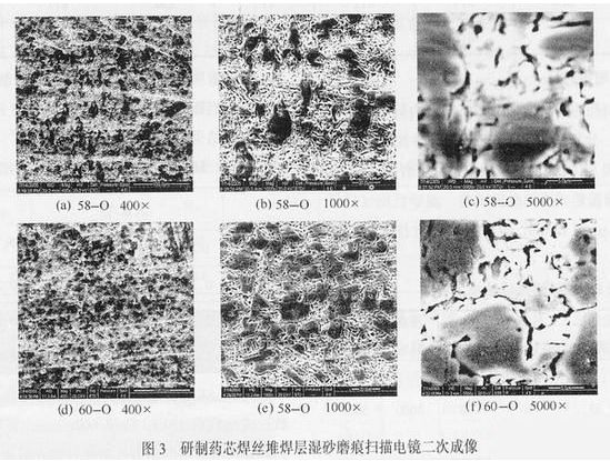 四、分析与讨论 1.自保护的实现 通过在药芯中组合加入微晶石墨、高碳合金、铝镁合金、硅铁、锰铁、钛铁、硼铁及稀土等物质,通过直接消耗氧气、氮气和降低周围环境的氧、氮分压两种途径,使周围气相的氧化性减弱成功地实现了药芯焊丝的造气-合金元素自保护。 碳在高温下有很强的氧化性,氧化后生成还原性的CO,能降低气相中N2、O2的分压,可以作为电弧下熔池的保护气体;碳氧化引起的熔池沸腾也有利于N2的逸出。 铝在高温下具有很高的活度,有非常强的脱氧、脱氮作用,能有效地减小焊缝气孔的敏感性,往往能起到脱氧与固氮的双重作用。镁的沸点为1100℃,在住电弧中可形成蒸汽,并与N、O结合,可到保护熔滴的作用。 硅、锰联合脱氧是焊接冶金中最常用的脱氧于段,可得到较好的脱氧效果。 硼与钛在高温下与氧的亲合力很强,还能与氮反应生成高熔点的BN、TiN,从而既降低氮的有害作用,又可作为熔池金属凝固时的结晶核心起到细化晶粒的作用。 稀土是4f系14个元素的总称,性质非常活泼,在180~200℃就能在空气中被氧化成Re2O3,在750℃能与氮反应生成稀土氮化物ReN,能起到脱氧脱氮的作用。稀土能有效降低焊缝气孔的敏感性,使熔敷金属中含氧量下降,总含氮量控制在一定的范围内,降低氮的有害作用。适量的稀土元素还可改善焊缝金属组织的形态、细化晶粒。 2.高耐磨性分析 为进一步分析研制药芯焊丝堆焊层的磨损和抗磨机理,还对湿砂试样的磨痕进行了扫描电镜分析,见图3。