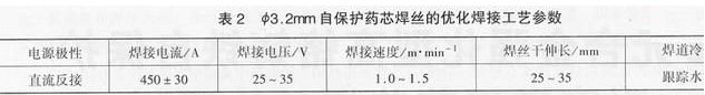 三、研制药芯焊丝的性能 1.焊接工艺性能 由于自保护药芯焊丝的工艺参数适应性小,所以试验中对其进行了优化,如表2所示。