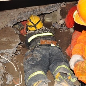 道路狭窄官兵人背肩扛运装备 18时20分,消防官兵相续到达事故现场。由于事发地点路段狭窄消防车无法直接到达事故现场,消防指挥员立即命令消防官兵下车将救援器材通过人背、肩扛的方式运往事故现场。经过10余分钟的努力,消防官兵迅速将救援器材全部运达事故现场。此时,现场一片混乱,现场公安民警和群众已先期将3名浅层埋压的被困人员救出。