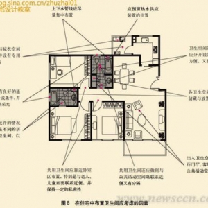 6.卫生间在住宅平面中的位置关系 卫生间是住宅中与厨房并列的另一个重要功能空间,但其面积一般较小,设备相对集中,同时还要兼顾通风、采光等各种条件布局,设计时难度很高。另外,除了考虑卫生空间本身的功能要求外,还要考虑它与住宅其他空间的关系。由于其功能上的特殊性和使用时间的不确定性等原因,使得住宅各主要空间都应尽量与卫生间有较为直接的联系,同时卫生间也应保持一定的独立性。图8以某住宅的平面图为例,归纳总结了卫生间在住宅中布置的要求。