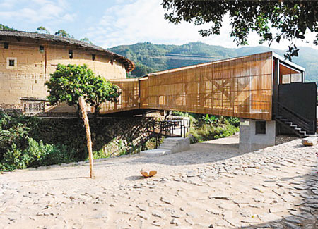 “桥上书屋”位于福建漳州市平和县崎岭乡下石村两座乾隆年间的土楼之间架起的一个桥上,由清华大学建筑学院教授李晓东带领他的学生设计构成,不仅为当地师生提供了一个学习平台,其建筑本身曾获得2009英国“建筑回顾”世界新锐建筑奖第一名,由此意外地成为当地一个热门的观光景点。![]() “桥上书屋”建筑在两栋具有300年历史的“到凤楼”和“中庆楼”这两座土楼之间。相传居住在这两个土楼的两个家族关系不和,经常发生冲突。在土楼之间搭起一座钢架与木结构的桥梁,寓意深远。 ![]() “桥上书屋”的主要建筑空间为上层,南北两侧为两个活动室,中间为一间管理用房,下层是单独作为交通使用的吊桥,南北两侧为公共活动广场,多功能的建筑为村民提供了日常学习、娱乐的场所以及便利的交通。 事实上,这座公益建筑重建了当地村民的公共活动空间,成为了古老村庄和未来沟通的希望和活力的象征。 |