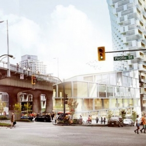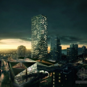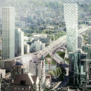 建筑采用多层结构,将被放置在格兰维尔和太平洋街道的三岔路口处,这里是连接温哥华市中心的和格兰威尔岛的入口点。设计富于挑战性的是,整个摩天大楼将建在一个十层高的基地平台上,而建筑本身则上大下小,有悖于平常的摩天大楼的设计形态。建筑的高层设计扫清了噪声和视觉污染,让人们可以获取更宽阔的视线,欣赏到温哥华有名的山水自然景观。据当地新闻,豪华摩天大楼将由407个住宅单元和95个租赁单元构成。总的来说,这个项目将提供80000平方英尺的新零售区域,包括食品店、酒店和药店,以及一个有609个汽车位的停车场,723个自行车位的停车场。该项目被放在温哥华最突出的位置,也被添进了许多公共设施,比如:购物广场、休闲中心和公共广场,在这些基础设施之外,还建设了绿地和花园,为来往的人们提供便利和享受。
