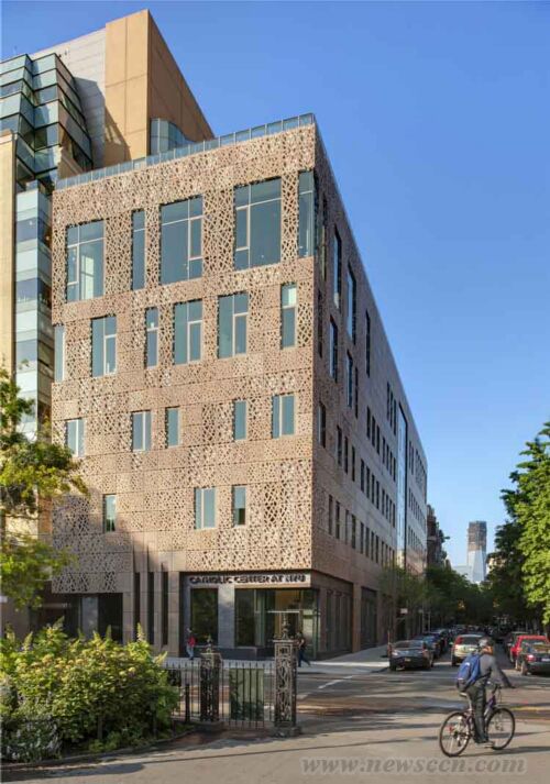 这是由Machado and Silvetti Associates建筑事务所联合设计的纽约大学学术与精神研究中心。该项目位于纽约市华盛顿广场公园的南端。从北端看过来,该建筑正好位于第五大道的中轴线上,同时可以欣赏到Washington Memorial Arch的优美景色。中心的设计显示了纽约大学卓越的建筑设计风范并获得了LEED黄金评级。 中心将具有不同宗教背景的学生和学者联系在一起,是一座多元化,多功能性的新建筑,并于2012年1月份正式完工。建造该中心目的是为纽约大学内几十个服务质量和水平低下的宗教组织提供一个居所。这座建筑的外立面肩负了很多城市问题的解决。首先外立面的设计要表达建筑本身的意义,其次还要体现建筑程序化的特点。一个多孔层压石面板组成的有机模式,置于程序项目的排列之上。这些石板是刚刚超过5/8厚,30宽40高的小体积板块被四个小钉子集成到预制的幕墙。中心内配备了教室、会议室、办公室和音乐实验室等设施。独一无二的全球会议中心设计将学生和纽约大学校园外的全世界的教员联系起来;而先进的多媒体系统则为整个校园的远程服务提供了最大化的支持。 |