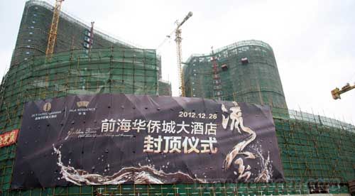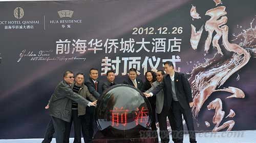 前海一直以国家级的高起点规划吸引着无数企业与外围资金,十八大结束后,新任总书记习近平首站访问前海,更是奠定了前海在深圳未来发展中所起的核心趋向力作用。华侨城酒店首入前海,斥资约15亿,为前海打造首个白金五星级酒店——前海华侨城大酒店。 前海华侨城大酒店“流金”封顶庆典在项目现场举行。这是前海首个白金五星级酒店,目前建筑主体已竣工。前海华侨城大酒店由一栋26层的白金五星级酒店、4层裙楼滨海会所,及一栋28层外售型私属酒店(华寓)组成。酒店部分预计今年底试业,2014年投入使用,287套外售型私属酒店华寓则预计今年年中发售,主力户型为90平方米一房、120平方米两房、170平方米三房,及顶层复式,带豪华顶级装修。宝安副区长孙波及华侨城酒店高管一同出席并见证了此次盛典。项目相关负责人通过现场讲解,从区域到定位,从功能到产品,向到场的嘉宾做了详细的项目说明。