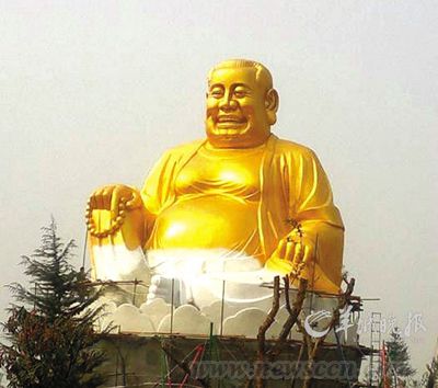 近日,河南洛阳偃师龙华欢乐园新建的佛一尊“佛像”,因为貌似留着大背头的弥勒佛,在网上引起热议。据悉,洛阳龙华欢乐园位于洛偃快速通道,该佛像是该园正在安装的一幢企业家雕塑,貌似弥勒佛。 5月22日,曾经在网上引起热议的河南洛阳偃师龙华欢乐园新建的“佛像”在争议中蒙羞退场后,如今,“大背头弥勒佛”正在“整容”中,其头部被移走。 如果说这雕像是一尊纯粹的弥勒佛像,乐园管理方愿意在园区里传播、弘扬佛文化,并无不妥。如果说这是乐园或其他某企业已故创始人的雕像,那么作为后来者,通过塑像纪念一下开疆拓土的企业元老,也没什么好说的。 然而,尴尬就在于,这尊刚刚铸起的“佛像”兼具弥勒佛与人的双重属性,人、佛两样一经混合,就显得“非人非佛”、不伦不类。弥勒佛的形象大家都是熟知的,大腹翩翩、笑容可掬、慈眉善目,当然了,关键的一点,他还是光头。那么,那位所谓的企业创始人呢,按已经基本成形的塑相来看,可能是个“大背头”,只是将他的形象特质与弥勒佛的袒胸露腹、莲花宝座“嫁接”在一起,就陡增是非,让人说不清,它究竟是“改头换面的弥勒佛”还是“挺着啤酒肚的企业家”。 不难猜想,这尊雕像的设计者对他心目中那位企业家充满景仰缅怀之情,急于表达出企业家心胸宽光、海纳百川、高瞻远瞩的高大形象,然而,表达方式却选择了粗放的“重新组合”,明显是好心办坏事,白白地浪费了大量的人财物时,整个雕塑缺少起码的美感,更谈不上什么深刻的思想与内涵。 一件作品的设计,不管是大楼还是雕塑,如何做到形神兼顾,如何通过恰到好处的“形”来展示“神”,让其观赏价值与实用功能完美统一,这是当下我们许多设计师都应当深入思考的课题。 【民意争锋】 看待欢乐金佛像 不如坦然一笑 欢乐园里果然从大门开始就让人欢乐了一把。乍一看的话,游客肯定会觉得这座金光闪闪的“佛身人面像”有些好笑,有些混搭不配,甚至是不是有些不尊重佛教界人士的意思?但笔者却认为,其实大可不必对这座长有头发的创始人佛像吐槽,这一金佛像的建造完全合情合理。 首先,作为企业创始人,想要让自己的身影出现在园内完全是人之常情。有些企业的创始人就是比较喜欢宣传自己,让自己频频露脸,比如“霸王”就出现在自己的洗发水包装上;陈光标的头像也同样出现在“好人牌”凉茶的罐子上。那么这位创始人通过一定的方式在园内露个脸无疑是很自然的事情。 其次,对于老板的“露脸秀”建造成这种风格,想必该欢乐园是经过了慎重的考虑而不是无底线的混搭。第一,佛身金像本身会给人一种吉利的感觉,作为企业方来说给老板建造一个“佛像”相当于是在给老板祈福、增添喜气,这无可厚非。第二,仿照弥勒佛的笑脸来COSPLAY也能够看做是一种笑脸迎客的表现,给来往的游客一进门时就带来一种欢乐好笑的感觉,这无疑也符合了欢乐园休闲、欢乐的主题。 所以,看待这座金佛像莫要将其过多地与宗教相联系起来,不如坦然一笑。(文/金真) 【新闻观察】 大背头弥勒佛是中国富人的缩影 大背头弥勒佛之所以引起了群众的反感,除了造型怪异让人无法接受之外,对于早已深入人心的传统文化以及宗教文化的亵渎也是让人们无法忍受的。这让人担心,今天出现了大背头弥勒佛,明天会不会就冒出来一个范冰冰版的观音菩萨,后天又会不会出现鸟叔版的孔子。对于传统文化,创新和弘扬都应建立在维护正统的前提下进行,否则对文化本身将是一种损害,任你建的再漂亮,群众也不会买账。 而值得注意的是,大背头弥勒佛其实并不是个案,它只是中国富人自己角色定位混乱现象下的一个突出事件。例如上海申花队的老板朱骏,就在2007年的鹿特丹港口杯邀请赛上与利物浦队的比赛中披挂上阵,并且在上半场踢了5分钟。其开了球队老板上场踢球的先例,闹出了国际笑话。而他却毫无羞耻心的在时隔五年之后又与阿内尔卡组成了“猪啊”组合,与阿根廷希望之星队踢了比赛。 笔者认为,朱骏的行为与大背头弥勒佛实际上如出一辙。由于国内的富人们大多数是近三十年赶上了改革开放才致富的,他们致富的过程中既扮演了投资人,又当着经营者,甚至还是生产者。所以现代管理在他们那里一文不值,他们乐于将自己投入到企业运行的各个环节中去,并不善于听取他人的意见。 而这种做法与理念带来的最为典型的问题便是其身份定位不清。一方面,他们在企业经营活动中的权力边界不清,他们既指挥部门负责人,又直接指挥办事人,将部门负责人的权力弱化不算,还导致了人员工作的混乱。另一方面,他们投资者与管理者的身份不分,作为投资人却屡屡直接干涉管理者的工作,甚至以乡镇企业家的脑容量去干预职业经理人的工作。这在国内一些球队老板身上体现的尤为明显,替教练训话的,替球员踢球的,无奇不有。 此外,近几年还涌现出了一个问题,那就是国内富人们对在社会责任上如何发挥自己的角色作用认识也不清晰。其中各类慈善活动尤为典型,慈善理应向着职业化、专业化的方向去发展,即职业的慈善工作者去从事专业的慈善工作。至于富人在慈善中应发挥的作用很简单,“赚更多的钱捐更多的钱”。我们没必要在慈善的过程中还要精心包装一下自己,也没必要自己亲力亲为的去做由别人来做会更好的工作。李连杰这方面