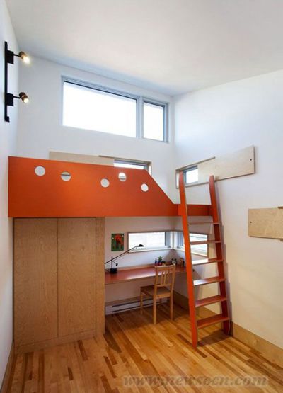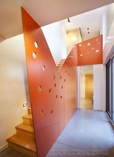 Nature Humaine事务所设计并完成了这座位于加拿大蒙特利尔的“蛇形屋”(Garden Snake)改造工程。户主因为刚生了一对双胞胎,希望将房屋的底层进行扩建,并且能为自己的三个孩子创造有趣的活动空间。 但是由于房屋上层还有其他住户,户主希望自己的空间能够向外而不是向上扩张。解决方案是将四间卧室都放在了后部的1350平方英尺的附属建筑中。这样的蛇形扩建使得原建筑的底层向后部庭院蜿蜒,并用拆除的车库剩下的砖块砌成了附属建筑。 父母的居住空间位于底层的砖房里,孩子们的卧室则处于上层的蜿蜒部分。明黄色的扶手引导者孩子们进入自己的空间。开放式的浴室让孩子们能一起洗澡,而孩子们的三间卧室都安装了架子床,家具都显得非常有趣味。