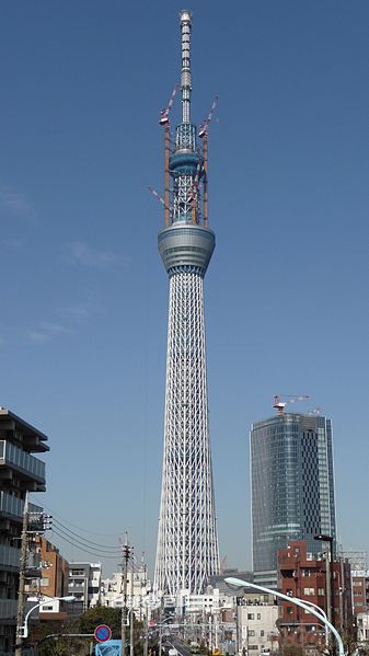 东京晴空塔,位于日本东京都墨田区的电波塔。由东武铁道株式会社和其子公司东武塔天空树共同筹建,于2008年7月14日动工,2012年2月29日竣工,同年5月22日正式对外开放。其高度为634.0米,于2011年11月17日获得吉尼斯世界纪录认证为“世界第一高塔”,成为全世界最高的自立式电波塔。也是目前世界第二高的建筑物,仅次于迪拜的哈利法塔(828米)。 |