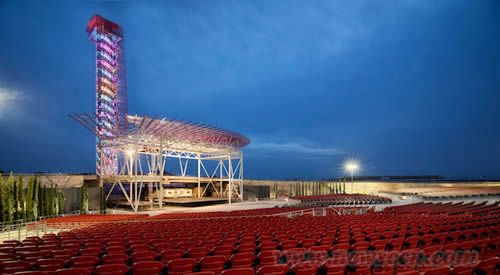 坐席区的设置是十分灵活的,可举办各种活动,而且还能增加1528个临时座位、宴席桌子或站位区等。舞台位于观测塔的基座,251米高的观测塔顶部是红色钢管,如同一把大伞遮在了舞台的上方。与此同时,悬在舞台上方的钢架还能安装照明设施和话筒等。 观测塔和圆形剧场成为大广场的背景要素。占地27英亩的广场三边是跑道,成为人们进入场馆必经之地,广场还有一座1.6万平方英尺的池塘,与各种景观区结合在一起,界定了各种活动可开展的区域。 |