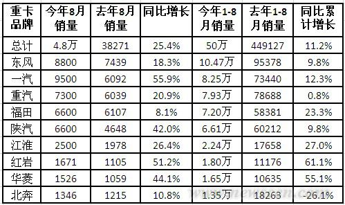 8月的重卡传统淡季,平淡中透出一丝亮色。记者最新获悉,8月份,重卡市场共约销售牵引车、自卸车等各类车型4.8万辆,同比大幅增长25.4%,环比今年7月(48864辆)只微弱下降了1.8%。