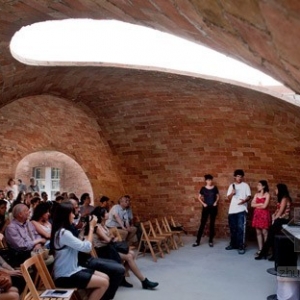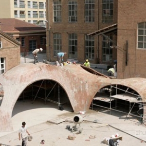 该项目位于巴塞罗纳的一个老院子,Sant Andreu 街的Fabra i Coats工厂原址。设计利用现代化数字工具3D建模软件Rhino和插件Rhinovault,对传统西班牙建筑技法进行了优化。来自苏黎世工业大学的研究员Philippe Block、Matthias Rippman和Lara Davis进行了模型开发。展厅采用了加泰罗尼亚拱顶。拱顶的制造技法,是将板砖纵向铺成柔和的曲线,创造一系列流畅的低拱。建筑师表示:“跟当今常见的建筑不同,该项目旨在还原纯手工建筑的专业性和想象力。”建筑系的学生和志愿者一同完成了项目的建设,利用十字交叉的金属棒和硬纸壳勾勒出基本框架。与原址密切相关的砖头材料,最终构成了四个拱形空间,弯曲的开口自然形成了门窗。