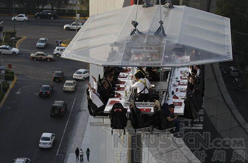 餐厅会提前烹制好食物,服务生在空中只需用微波炉将食物加热,即可供顾客食用。顾客需花费230美元(约合人民币1440元),即可享受一顿大餐。光顾过该餐厅的顾客还温馨地提醒说,爱穿高跟鞋的女性在就餐前一定要把鞋掉,放在地面,否则鞋子很可能会掉下去。 |