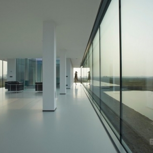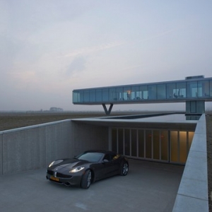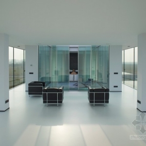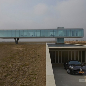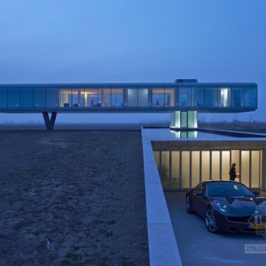 建筑设计:保罗•德•瑞特建筑设计事务所 设计主旨在于创造一个简约而极具吸引力的建筑结构,达到完全自立,自己加热水资源,自己回收废物。2个堆叠的立方体构成了整个设计,一个位于地下,另一个为浮于景观之上的玻璃盒状体量。建筑的入口位于地下层,拥有停车场、储藏室、一个浴室和一个工作室。地面之上,开放式布局的生活空间,景观视野开阔,其内厨房、卧室和浴室独立分布。为了确保全年环境舒适,特别的“气候式立面”由绝缘玻璃外层和反射阳光的织物内层组成。织物可以向下移动,形成气腔,让建筑内的空气通过一个被动通风系统循环利用。此外,还特别设计了一个炉子煮热水,其电力来自屋顶太阳能板和特别建造的风车。
