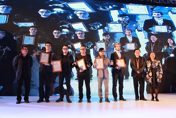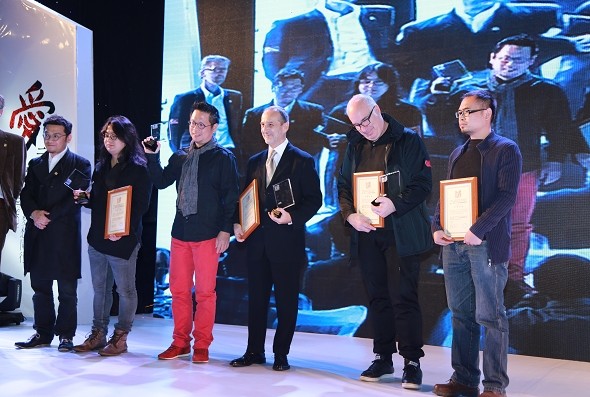 “年度餐饮/酒吧空间大奖”获奖者合影 随后,由吴家骅教授和刘力平先生二老共同揭晓并颁发“年度酒店空间大奖”,获奖设计师与作品分别是: 重庆威斯莱喜悦酒店(渝北店) 设计师/赖旭东(重庆) 无锡舒隅酒店 设计师/林斌(福州) 瑞典Radisson Blu滨江酒店 设计师/Bronwynn Welsh、Nicholas Veitch(瑞典) 马来西亚Macalister Mansion酒店 设计师/Colin Seah (新加坡)