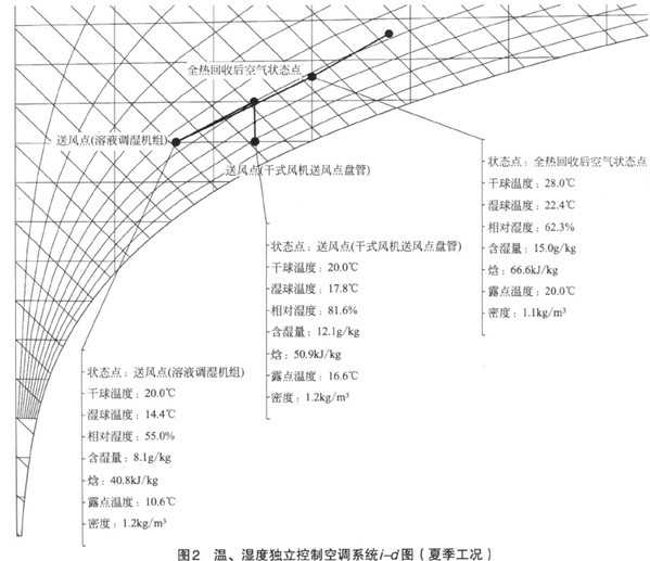 办公区域的空调房间采用温、湿度独立控制空调系统,采用辐射供冷暖加独立新风空气调节的系统形式。温、湿度分开处理,房间内潜热负荷由独立新风处理机组(热泵式溶液调湿新风机组)负担,通过溶液除湿后的新风可带走室内的湿负荷,房间内显热负荷由楼板辐射供冷暖系统负责处理,不足处由新风处理机组承担。温、湿度独立控制空调系统i-d图见图2~图4。