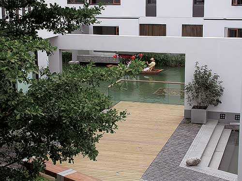 新中式景观设计采用框景、障景、抑景、借景、对景、漏景、夹景、添景等中国古典园林的造园手法,运用现代的景观元素,来营造丰富多变的景观空间,达到步移景异,小中见大的景观效果。万科第五园运用现代简洁的景墙窗框,将广阔的水景及对面的建筑有选择地摄取空间的优美景色,并将动态的琴声飘扬的小舟纳入其中,使人坐在园中,透过景窗欣赏美景,聆听乐曲,如临仙境。框景手法的应用加大了景深效果,形成了一幅美丽的画面(图1)。