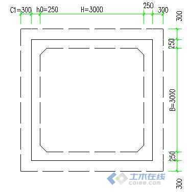 下以一小型水池作为例子,水池内空长度H=3000mm,水池内空宽度B=3000mm,池面板活荷载取P=1.5(KN/㎡),池内空高度h0=2000mm,钢筋混凝土密度25KN/m3,素混凝土23KN/m3,覆土密度18KN/m3