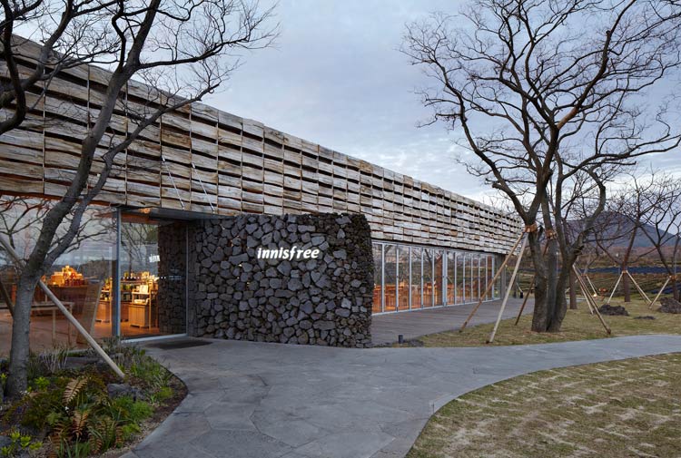 悦诗风吟大楼是一个矩形体量,与茶石的宽度一致并直接相对,中间是gotjawal,位于同一轴线上。这样的选址是为了“连接”两个建筑物,因此,路旁的森林成为建筑体验的一部分。由于从西侧的gotjawal森林仅能看到部分悦诗风吟大楼,而茶石位于森林的另一端,因此通过将分别位于东西两端的绿色空间经由建筑连接起来,游客们也被带领到了森林中。该空间最初被规划为“森林画廊”,最大化地朝向森林开放,四面玻璃窗的设计为人们提供了从各个角度欣赏周围景致的视野。室内装饰的材料来源于周围的自然环境,比如木材和玄武岩。因此,34.8m×11m的商店和咖啡厅空间被赋予了自然气质。