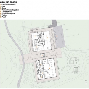1.入口 2.咖啡馆 3.商店 4.访客中心 5.售票点 6.展厅 7.卫生间 8.植物中庭 新建成的游客中心耗资2700万英镑(约合2.67亿元人民币),距离巨石阵大约2.4公里。建筑内布满细长的立柱,屋顶为超薄的扭曲金属板。屋顶下方是两个巨型的盒子,分别采用玻璃和木材。游客中心里有常设的展览,用250余件展品讲述几千年来人们对巨石阵的认识。展品中有两个14世纪的手稿,被认为是最早的关于巨石阵的画作。此外还有一些出土的罗马时代的钱币和首饰,首次同公众见面。展览的一大亮点是巨石阵旁边一处5500年前墓穴主人的复原模型。他曾经生活在新石器时代的索利兹伯里平原。当游客中心18日对公众开放后,老的售票处和巨石阵周围一些不必要的设施将被拆除,一条原来直通巨石阵的繁忙的公路也将被关闭并覆盖以绿草。游客将可以乘坐特殊摆渡大巴前往巨石阵,或可步行前往。这些措施都是为了保持巨石阵周围的怡人乡村风光。 负责巨石阵管理和维护的英国文化遗产保护机构负责人西蒙·塞利说:“游客们第一次能够在这里看到那些他们从未见过的文物,了解巨石阵的历史,这将给巨石阵赋予生命。”英国文化大臣玛丽亚·米勒表示,巨石阵是英国的标志之一,被列入世界遗产名录,每年吸引世界各地约100万人次的参观者,早在1927年就有人提议修建游客中心。“经过多年的决定,我们终于带给了游客一种他们早就应该能够享受到的体验。”