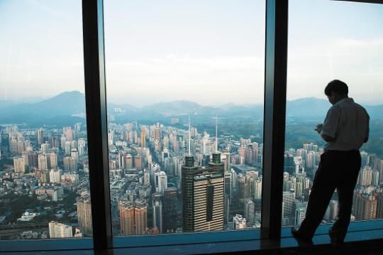 市民站在深圳京基100大厦96层拍照,窗外层仰视了那么多年的地王大厦被踩在脚下
