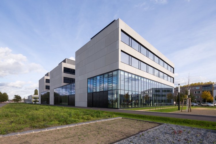 Adlershof目前已经发展成为柏林地区最先进的光学产业基地之一,这里为先进的科技公司提供实验室租售、办公场地等可满足其发展的各项服务需求。18个工作单元分布在超过9个的建筑模块中并根据不同的研究需要、产品应用开发等功能进行了独特的设计。一层既可以作为工厂也可以用作共享技术中心,上面则是三个大小类似的2层楼高的建筑单元,用作办公和实验区。,屋顶上覆盖着巨大的光伏电板用以测试该区域的能源消耗,楼与楼之间的花园式步道给员工提供了放松的空间。垂直于地面的钻孔用来产生热能和制冷;混凝土的天花板同样降低了室内的温度,并通过中庭设计确保室内的宜人温度。