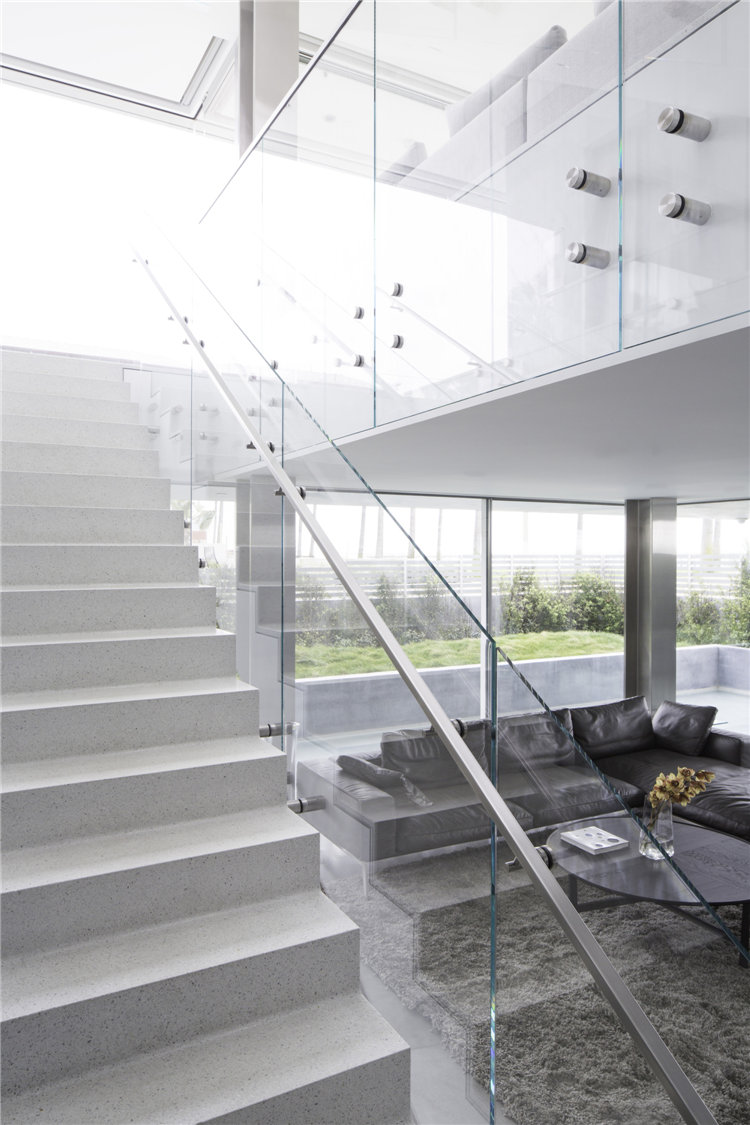 客户有三个简单的设计要求——电梯、露台、以及在主沐浴房能看见大海。建筑转角处提供了许多观赏区,同时设有大量出挑的露天阳台。白色的石膏墙与玻璃落地隔墙形成对比。首层的家庭活动室采用宁静的色调。这层还布置了日常生活的功能区,如储藏室、电梯、家庭活动室等,除此还有一个藏有1200瓶葡萄酒的地窖,以及带有内置光照功能的沙滩沐浴等辅助功能区。二层作为家庭空间的核心区,提供了充足的社交空间,包括露天阳台、客厅、厨房等。房子最东边设有两间卧室及公用浴室,为客人提供私密与安静的空间。主卧室坐落在西侧最大的海景房,内设有温暖的壁炉。
