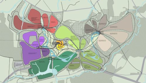 “公园被分为六个功能单元(商业、娱乐、自然和体育,和一个预留发展区),,整个公园从这六个功能单元向周围发散辐射。并且每个单元中都有一个中心广场和公园里散发出的所有元素。 每个单元都有一个中心广场,公园中心处的开放广场将六个单元进行连接。”