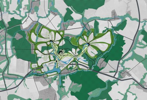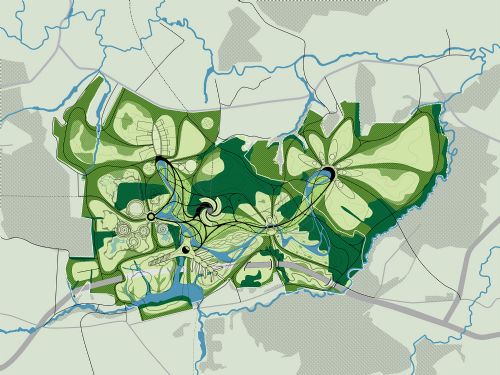 “基地内有一座30米高的小山,内部现存的的森林和水系作为此次公园设计和布局的基础。 所有必需的项目元素和单元都必须与这些现存的自然条件发生关系。 在此次设计中现有的森林得到了有效的保护同时又创建了新的森林,从而形成了一个绿色的网状结构,并且公园的外围更贴近自然,靠近中央公园和广场的地方也更加城市化了。在对水的处理上,设计中保留了原有的水并且又向中央公园中引入了新的水系”。