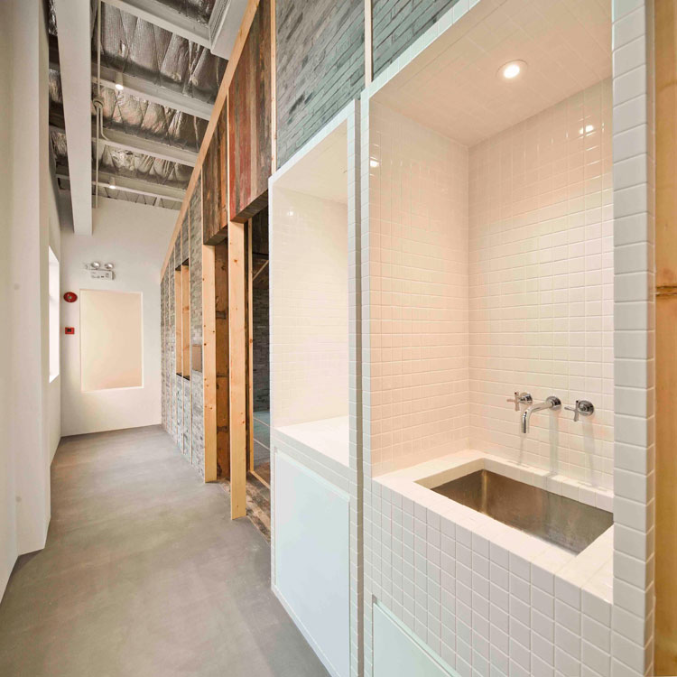 同时,设计师为这幢建筑新增了天窗,光线将室内狭长的通道投下长长的阴影,形成儿时记忆中那弄堂深深深几许的旧时记忆。
