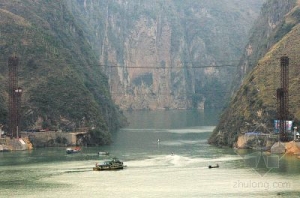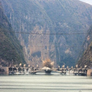 “……5、4、3、2、1,起爆!”昨日下午4点48分,随着三声巨响,巫山龙门大桥在旋转180度后永沉江底。175米试验性蓄水后而被龙门大桥“封锁”的小三峡也成功“解锁”,游船又可出入无碍。 原因:小三峡被“锁喉” 巫山龙门大桥位于小三峡入口,横跨大宁河,桥面海拔高度为185米,曾雄伟壮观高踞峡口,其势若弯弓射雕。今年库区实施175米试验性蓄水后,龙门大桥与江面净空高度不到10米,长江里的大船进不去,小三峡里边的游船出不来,大桥像一把锁将小三峡“锁喉”。11天前,爆破工程组进场开始钻孔。