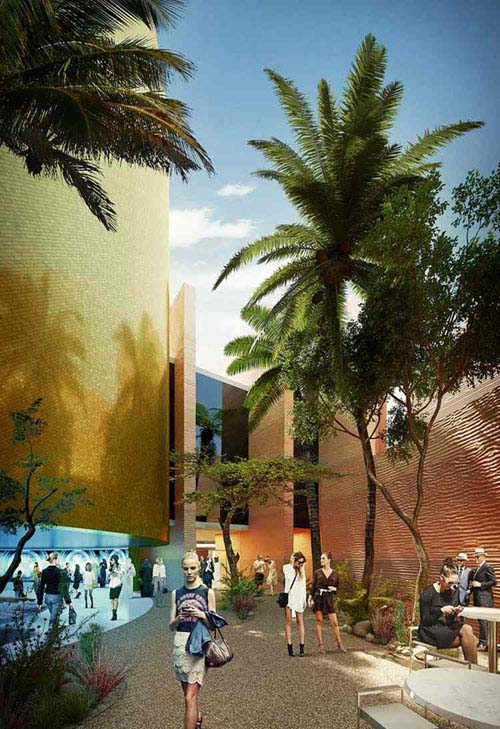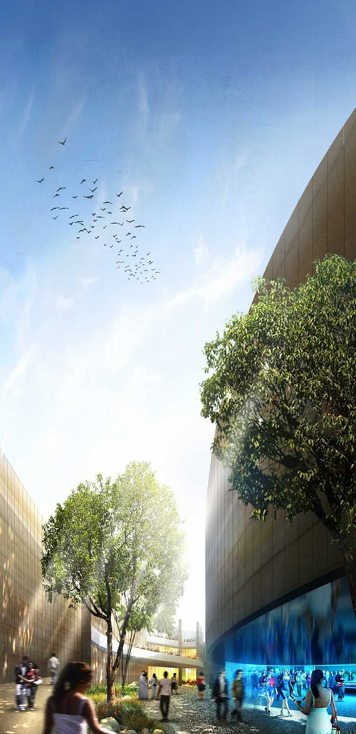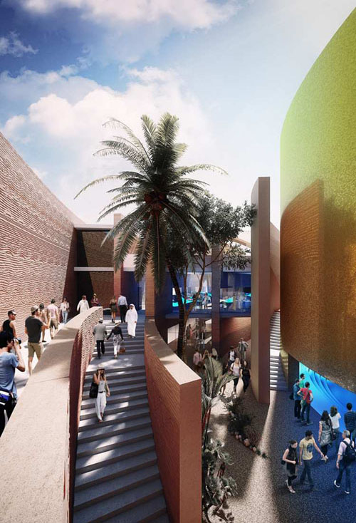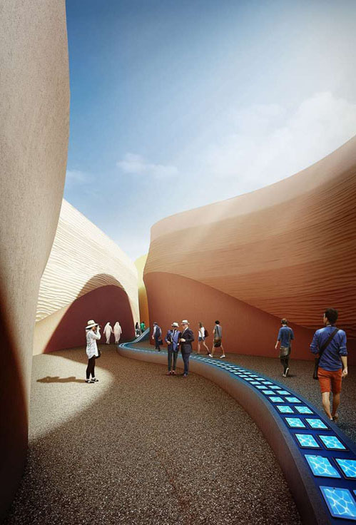 阿联酋国家馆将会建在靠近世博中心的一个140米宽的基地上,通过一道“引人注目的峡谷式入口”后人们才能真正领会到其中的魅力,该入口由两面12米高波状墙构成。内部设计中福斯特继续延续了马斯达尔城“封闭式社区”的设计方法,这也是传统的沙漠化城市规划设计准则之一。 场馆中央有一个大礼堂,游客进入后首先会对阿联酋历史有个初步认知,随后依次进入其他空间区域学习到有关“沙漠绿洲”的知识,最后则来到咖啡厅和餐厅,这样的环绕式设计也恰好迎合了本次世博会的主题:给养地球。 福斯特表示:设计的难点在于为两种不同的气候城市打造具有各自特点的元素,在米兰为游客创造自然舒适空间的同时,考虑阿联酋国家馆设计的实际需求,为了阻挡暴烈的阳光照射必须采用遮蔽物。