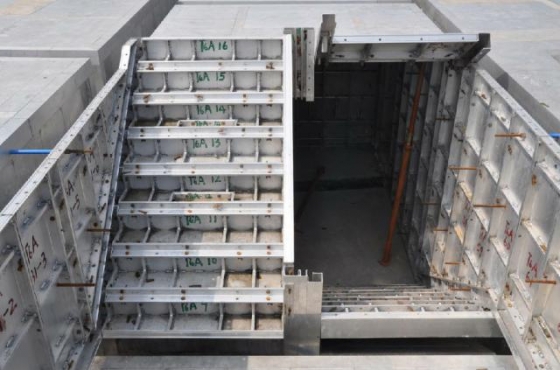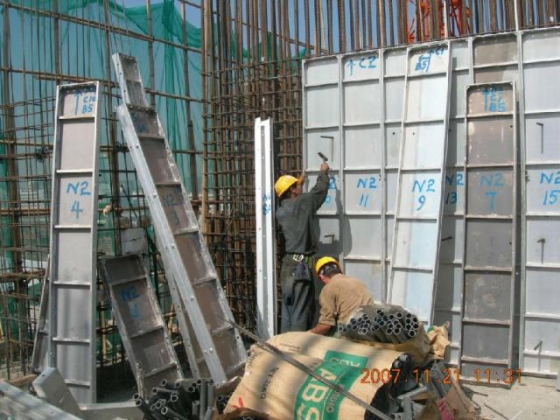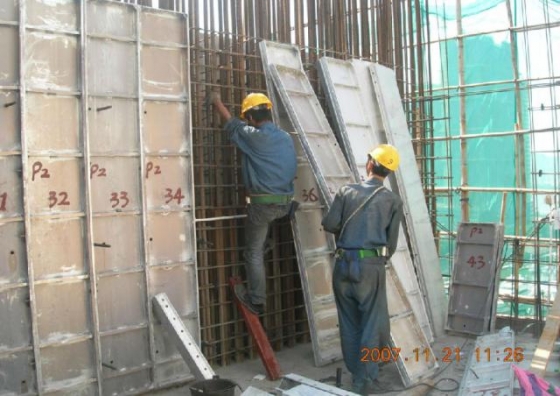二、铝合金模板系统的设计思路: 铝合金模板技术,恰恰是顺应了市场需求,解决了上述施工中存在的问题,才得以首先在发达国家诞生并被广泛应用。是市场规律这只无形的手,决定了当一个国家的经济发展水平达到一定程度后,人的价值变得重要,施工安全和施工效率,是任何施工企业不得不追求的目标时,像铝合金模板这样科技含量较高的产品,必然得到了发展应用的空间。更多地采用高效率的设备,从而尽量大地减少对人工的依赖,是工业化国家不得不走的路。铝合金模板技术,恰恰适应了这种趋势。 铝合金模板技术自诞生以来,自美国开始,在世界许多国家的应用过程中,得到了不断的发展与完善,在很多细节上已经演变成许多不同特色的产品设计。本文以广州市景龙环保科技有限公司设计、制造的景龙铝模板系统为例,对铝合金模板技术,做个简要的介绍。景龙铝模板系统是该公司在综合国外相关技术的优点的基础上,结合国内的施工时间,设计、制造的铝合金模板系统。 《如下是施工图片》